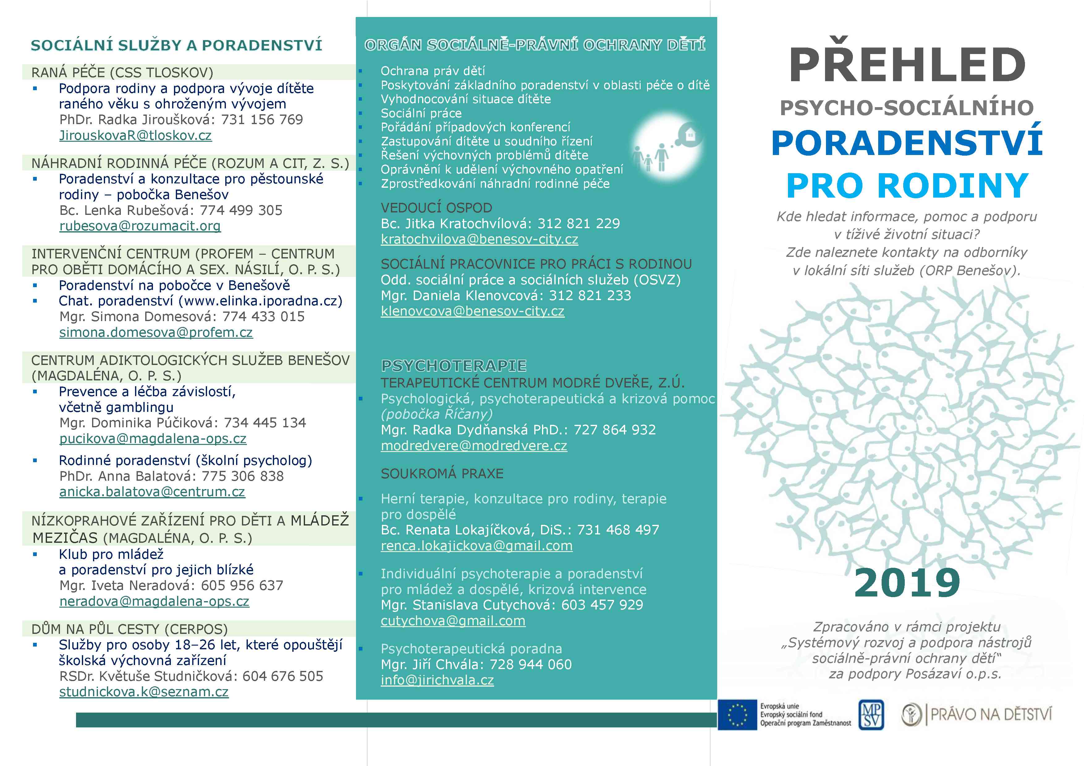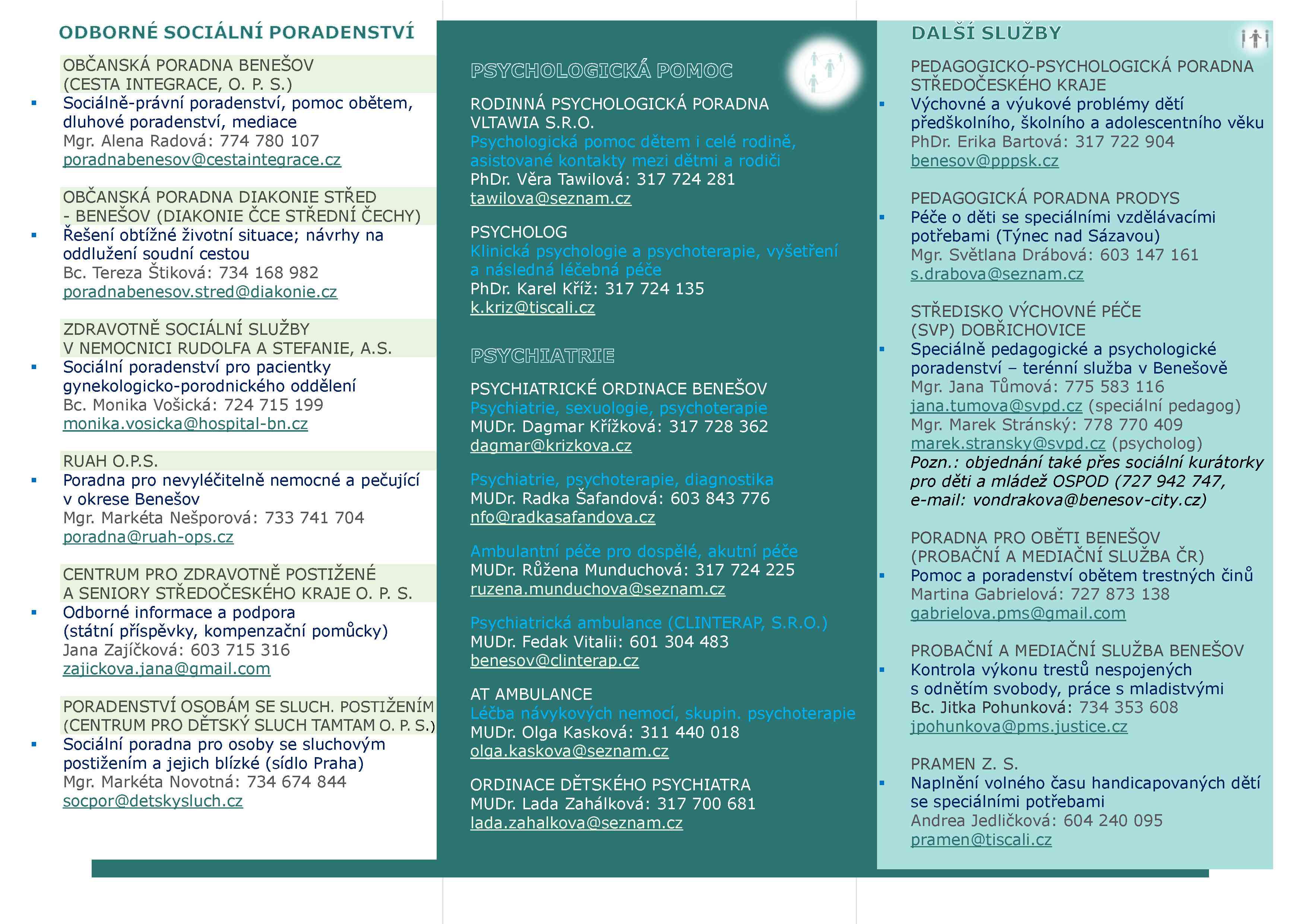 V připojeném letáčku (ke stažení zde ) najdete základní kontakty na odborníky z Benešova a okolí, na které se můžete obrátit v tíživých životních situacích, včetně odborného sociálního poradenství, sociálních služeb pro rodinu, psychologů, pedagogických poraden, psychiatrické pomoci a dalších služeb. Je zde celkem 34 osob/odborníků